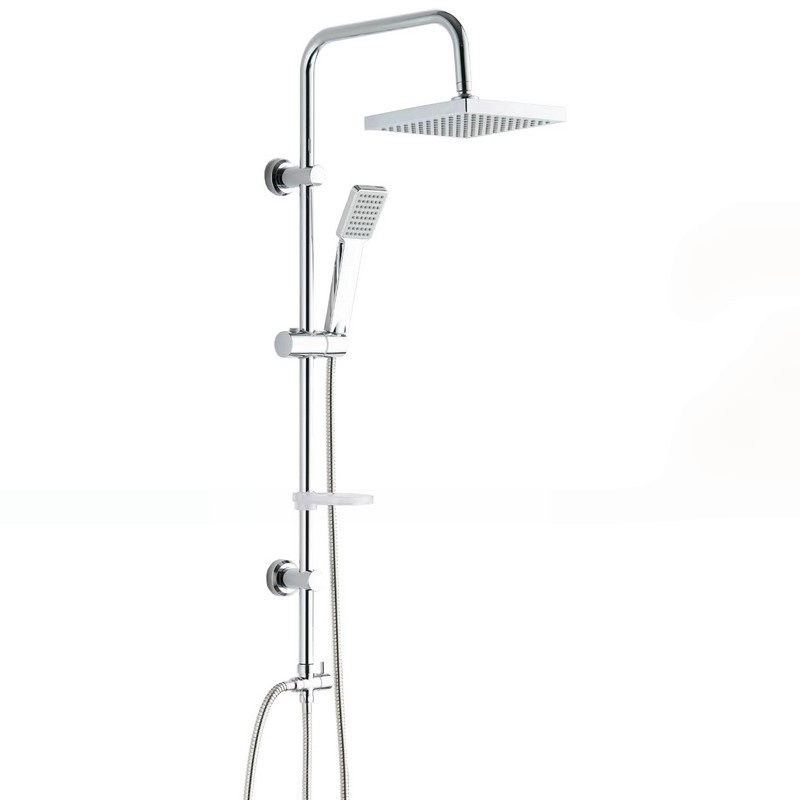 Set colonna composto da asta in AISI304 tonda Ø 22 mm, altezza 950 mm, supporti laterali regolabili, laterali e scorrevole in ABS cromato, soffione 200×200 mm in ABS, doccia in ABS anticalcare 1 getto, portasapone trasparente, flessibile in acciaio doppia aggraffatura da 150 cm