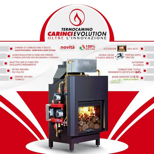 il nuovo progetto CARINCI Evolution 2015, termocamino con camera "a secco" con assenza di incrostazioni e scambio termico costante nel tempo, che mantiene calda l’acqua nei tubi anche a 10-12 ore dallo spegnimento, presenta emissioni di anidride carbonica dello 0,13% e rendimento certificato dell'84%;