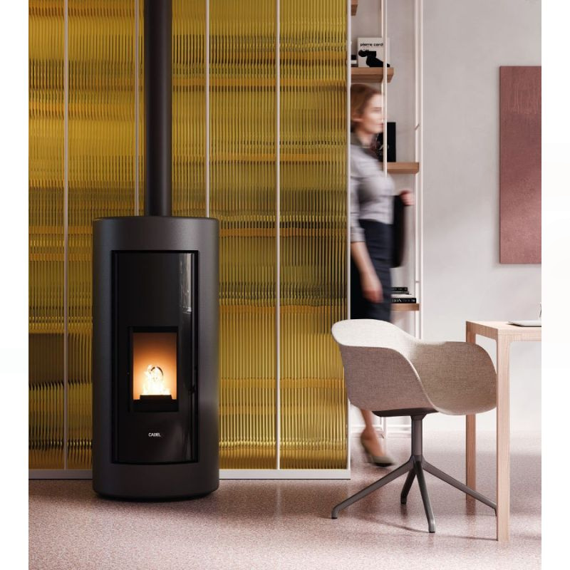 Linee morbide e materiale tech per una stufa a pellet stagna di design.