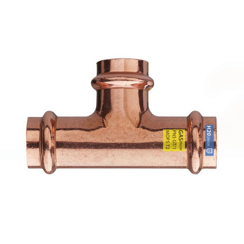 Raccordo a T con estremità a pressare profilo V della serie FRABOPRESS KOMBI per tubi in rame, completo di elemento di tenuta in HNBR, utilizzabile indifferentemente per applicazioni acqua e gas
