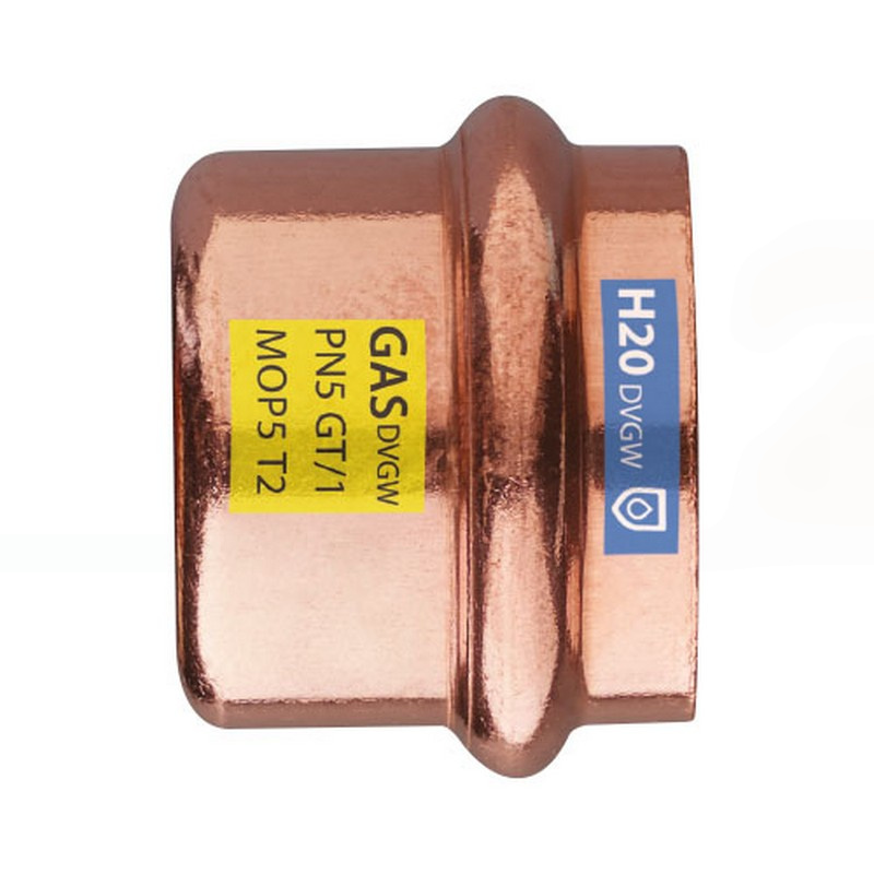Terminale di chiusura con estremità a pressare profilo V della serie FRABOPRESS KOMBI per tubi in rame, completo di elemento di tenuta in HNBR, utilizzabile indifferentemente per applicazioni acqua e gas
