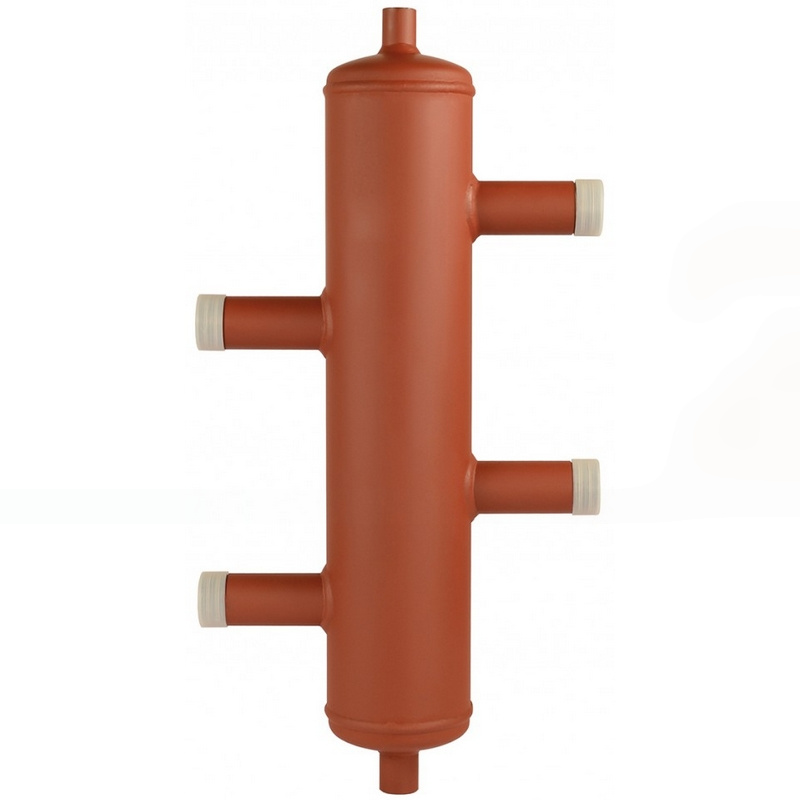 COMPENSATORE IDRAULICO PER CENTRALE TERMICA DIACOM con funzioni aggiuntive di separatore d’aria e defangatore, attacchi filettati 1"1/2 M, manicotto per valvola di sfiato 1/2" F, manicotto per valvola di scarico 3/4" F, temperatura massima 90°C, temperatura minima 5°C, pressione massima 5 bar, materiale acciaio al carbonio EN10255, verniciatura con primer a base acqua colore rosso.