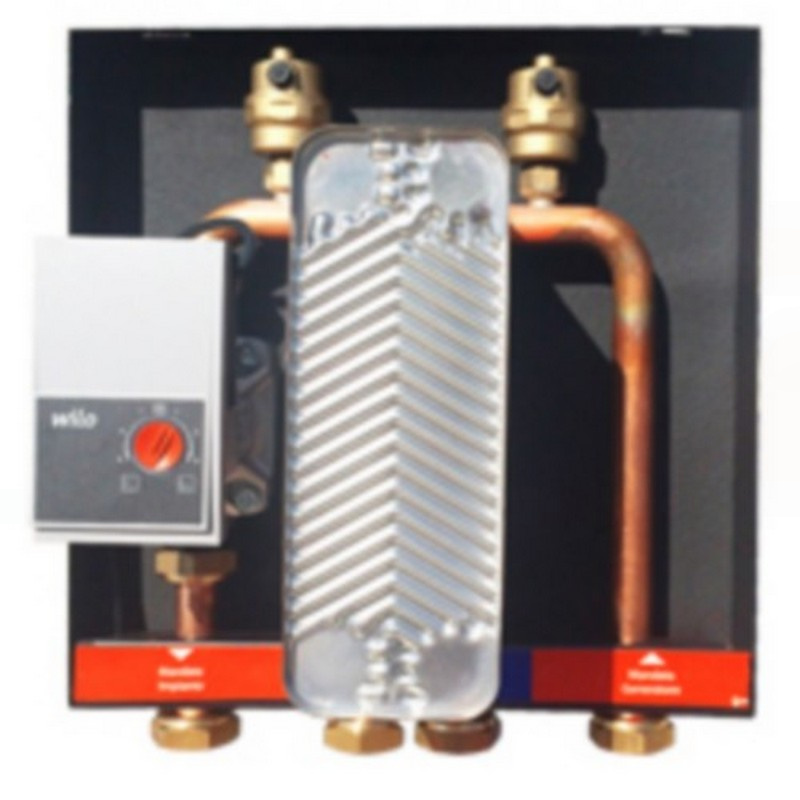 E’ un modulo idrotermico per la separazione idraulica di due circuiti, composto da tubazioni in rame, scambiatore di calore CARINCI SERIE C, jolly di sfiato e circolatori, tutto collocato all’interno di una cassetta metallica aperta.