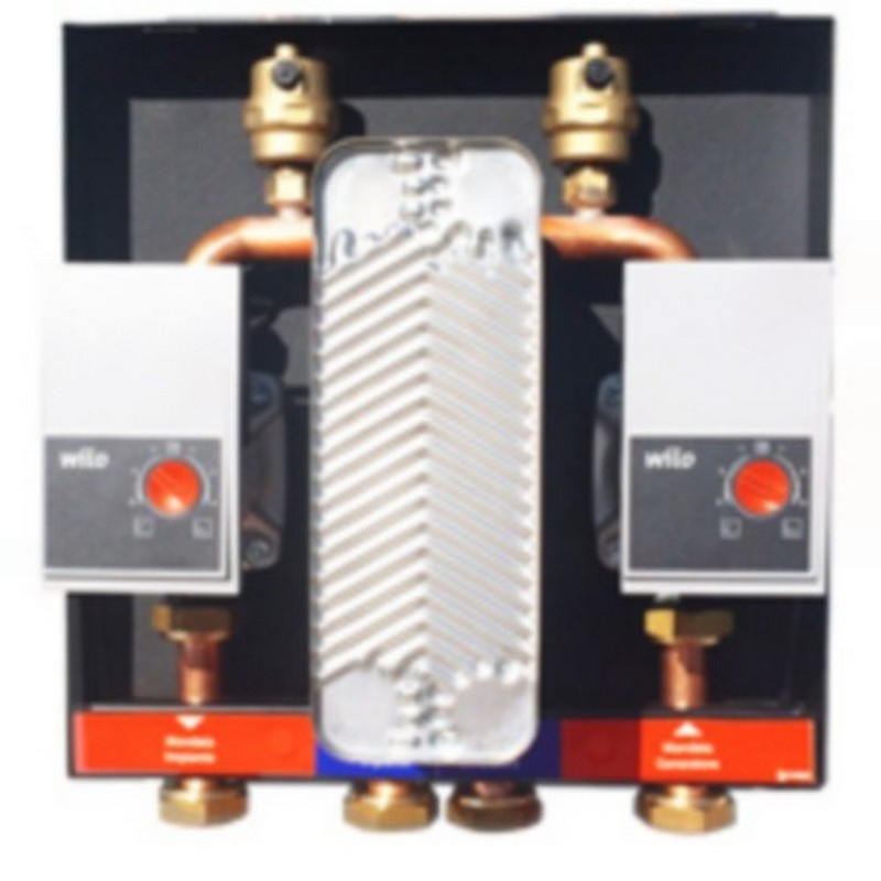 E’ un modulo idrotermico per la separazione idraulica di due circuiti, composto da tubazioni in rame, scambiatore di calore CARINCI SERIE C, jolly di sfiato e circolatori, tutto collocato all’interno di una cassetta metallica aperta.