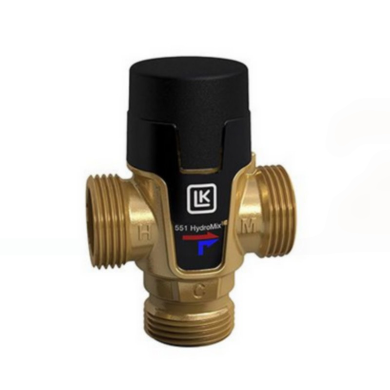 LK 551 HydroMix è una valvola miscelatrice per impianti per acqua sanitaria e per sistemi di riscaldamento. La valvola miscelatrice ha un elemento termostatico per regolare la temperatura dell'acqua al valore desiderato fra 35°C e 65°C. La valvola ha una funzione antiscottatura che chiude il flusso di acqua calda in caso che la fornitura di acqua sia oltre il range stabilito.